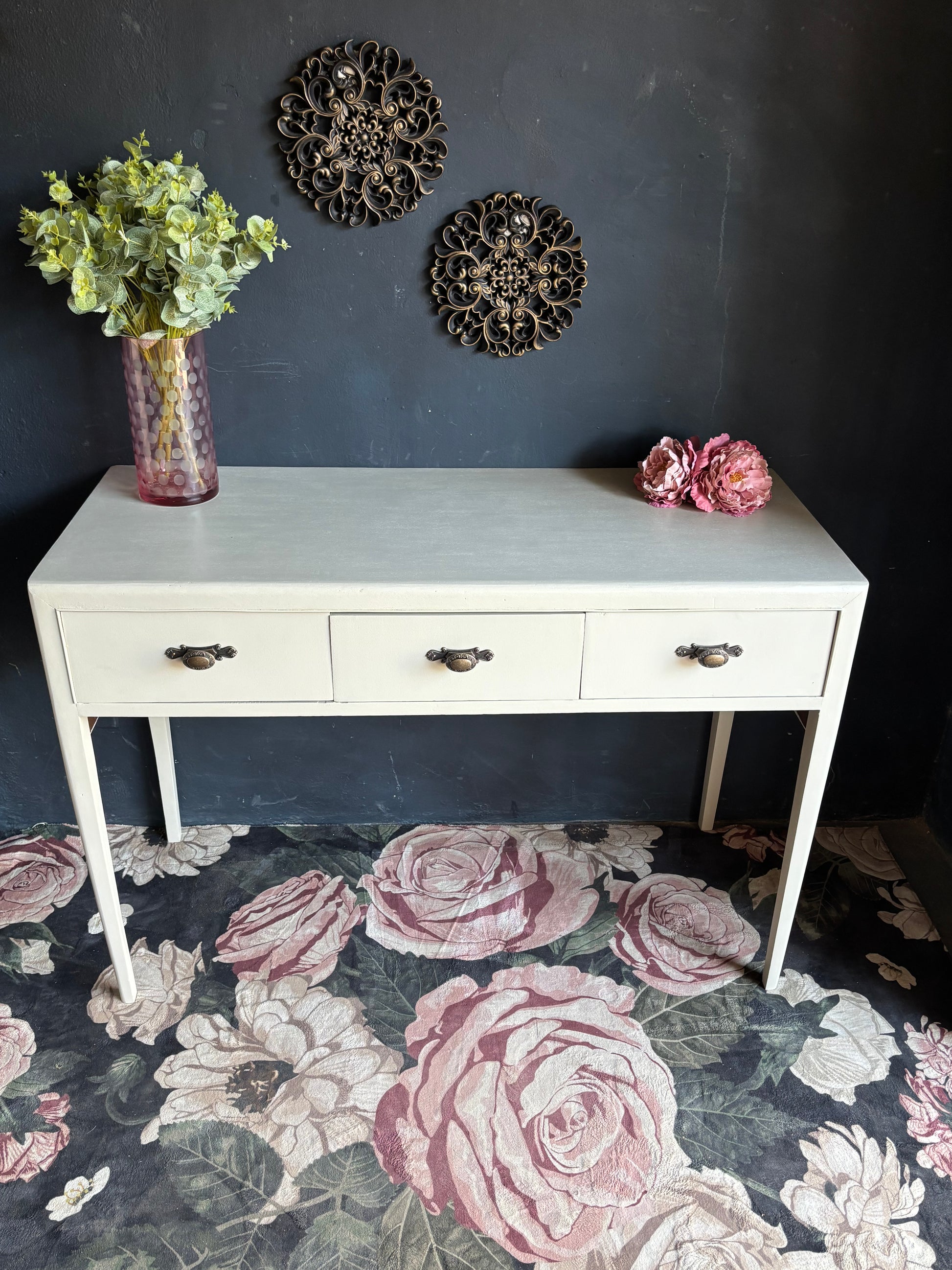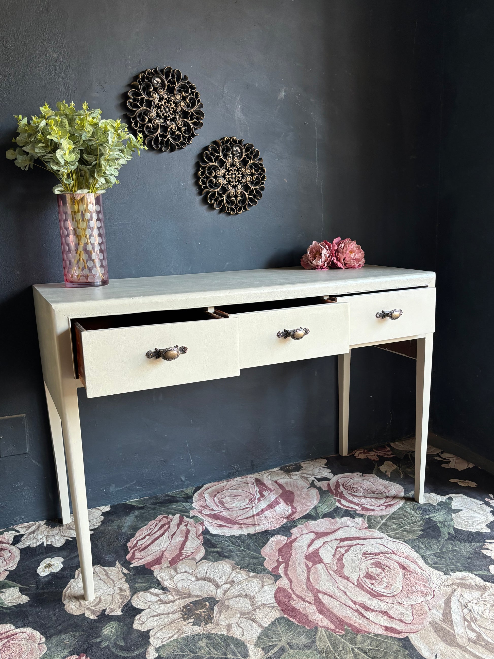 Pair this console with a vintage mirror or brass wall décor to accentuate its old-world charm. Add a vase with soft-toned florals and a scented candle to complete a cozy, curated look that exudes timeless appeal.