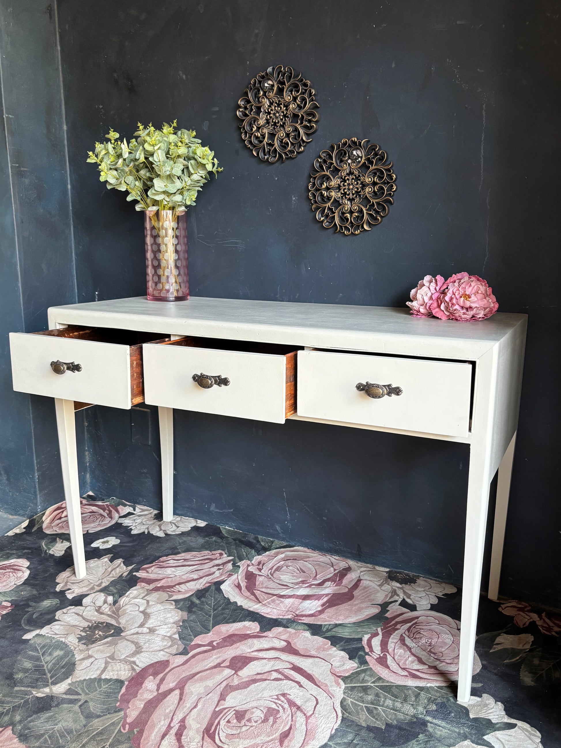 - Features three spacious drawers with antique brass-style handles