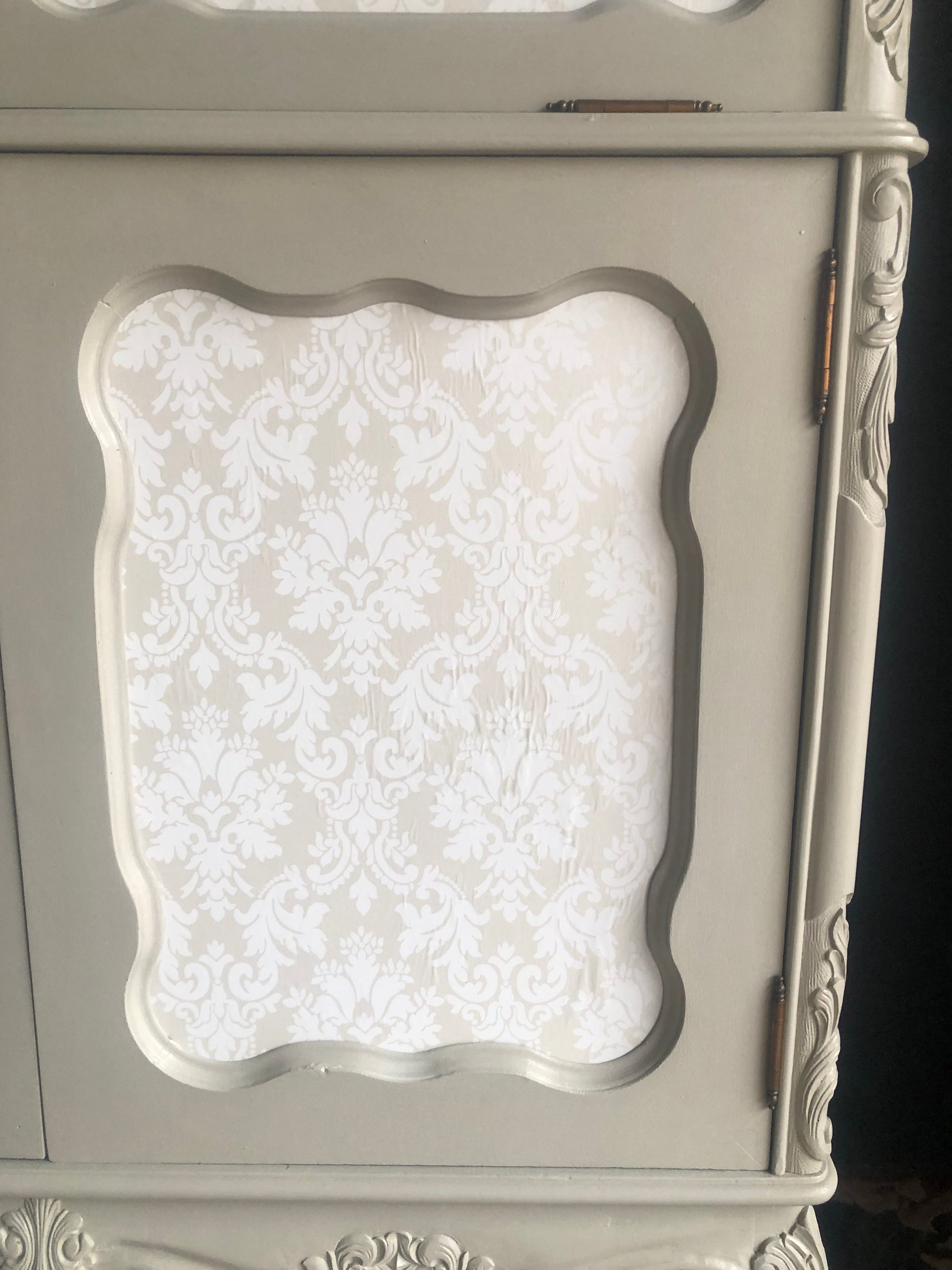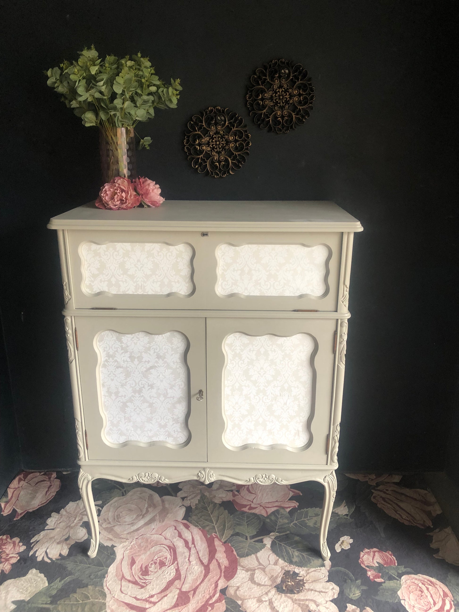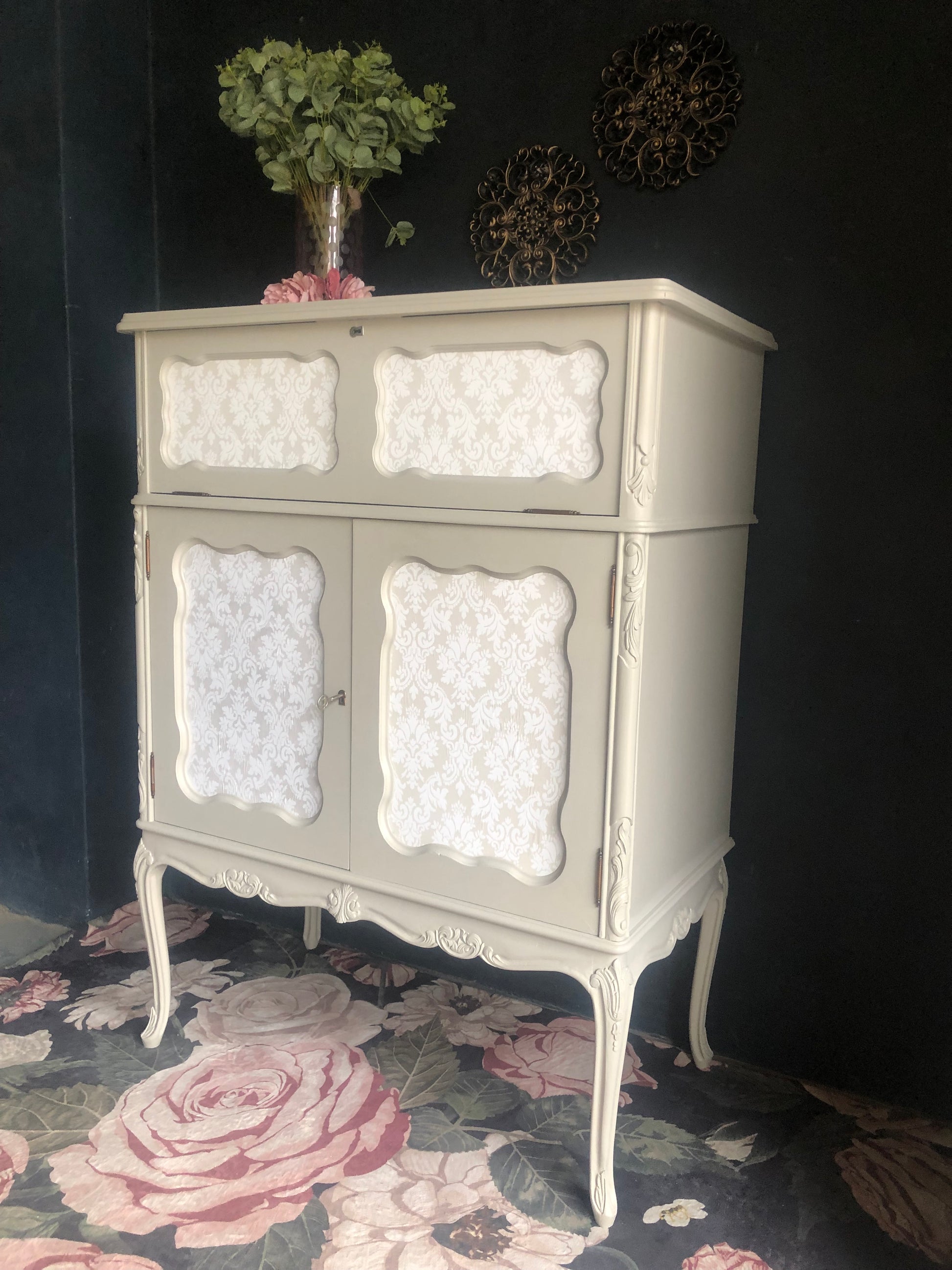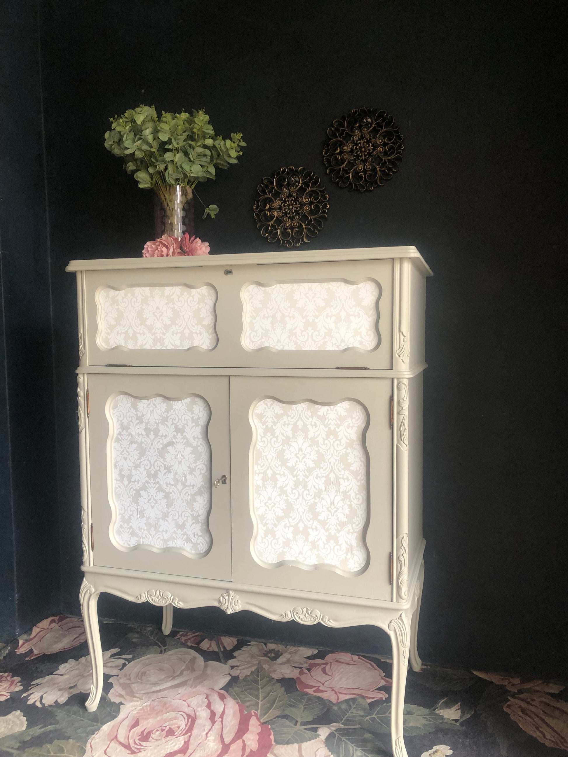 This beautifully restored cabinet combines French-inspired design with versatile functionality. Its delicate carved details, soft neutral finish, and decorative paneling make it a standout piece for any home.