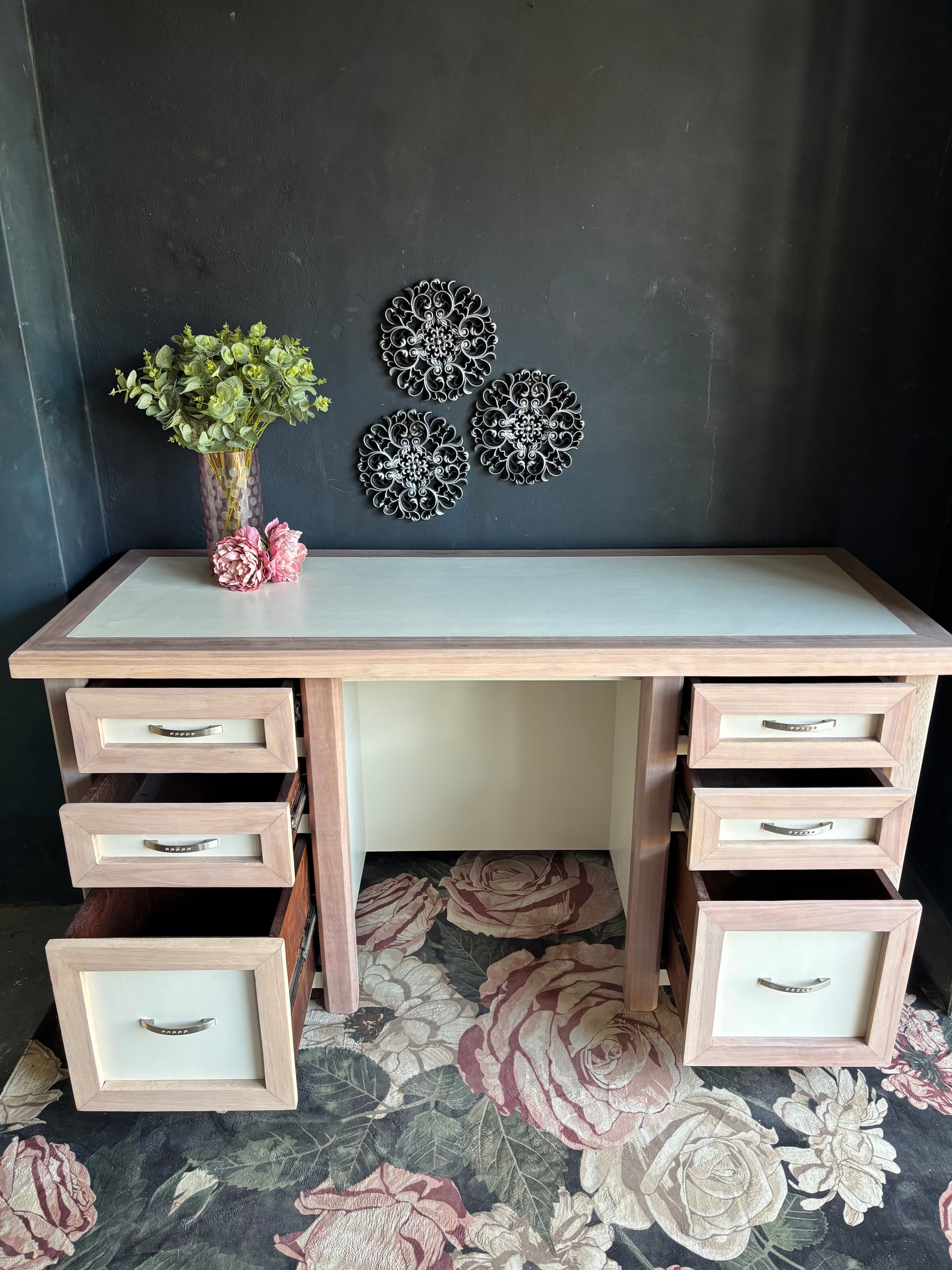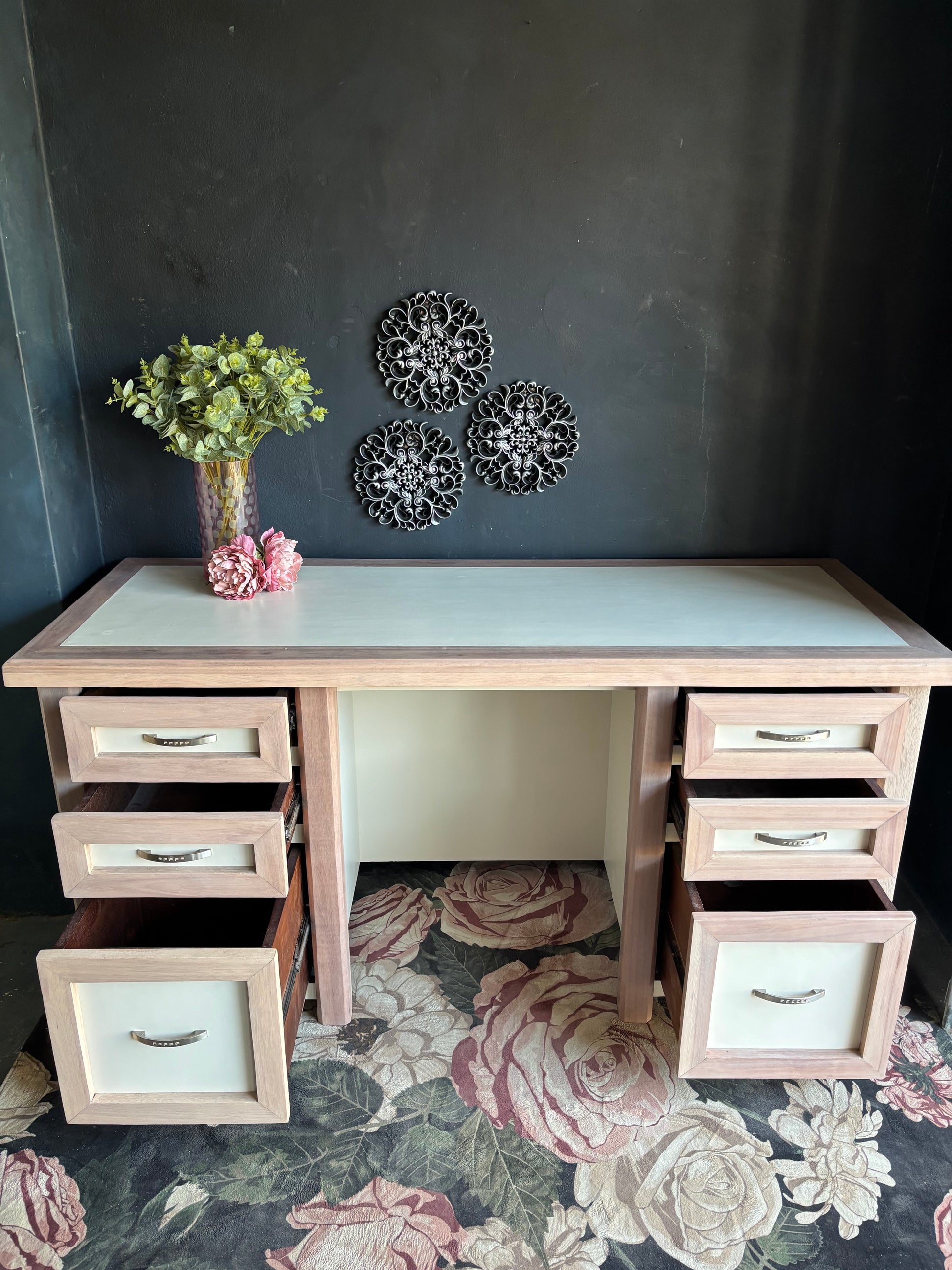 This beautifully restored dual-pedestal desk blends functionality with warm, natural tones. Painted in soft beige and framed with washed saligna wood, it adds both charm and sophistication to any home office, study, or creative space. With six drawers — three on each side — this piece offers practical organization while maintaining a timeless aesthetic.