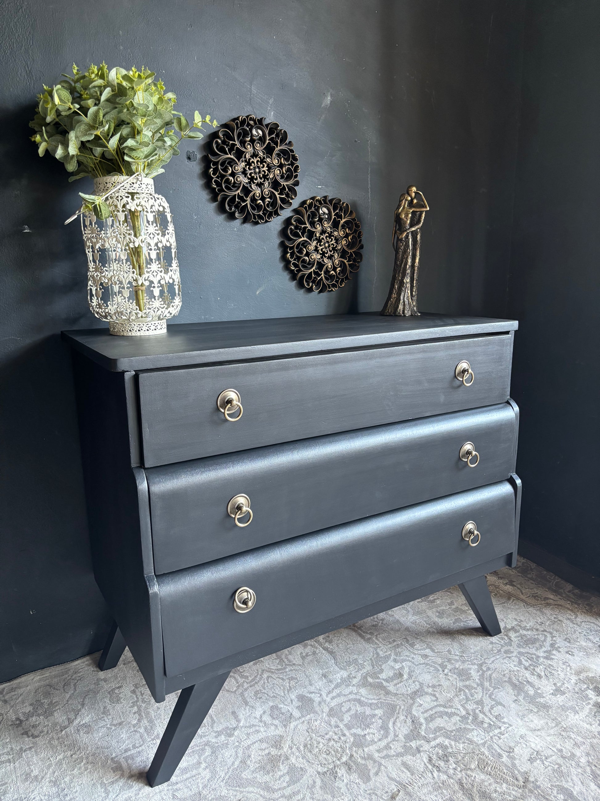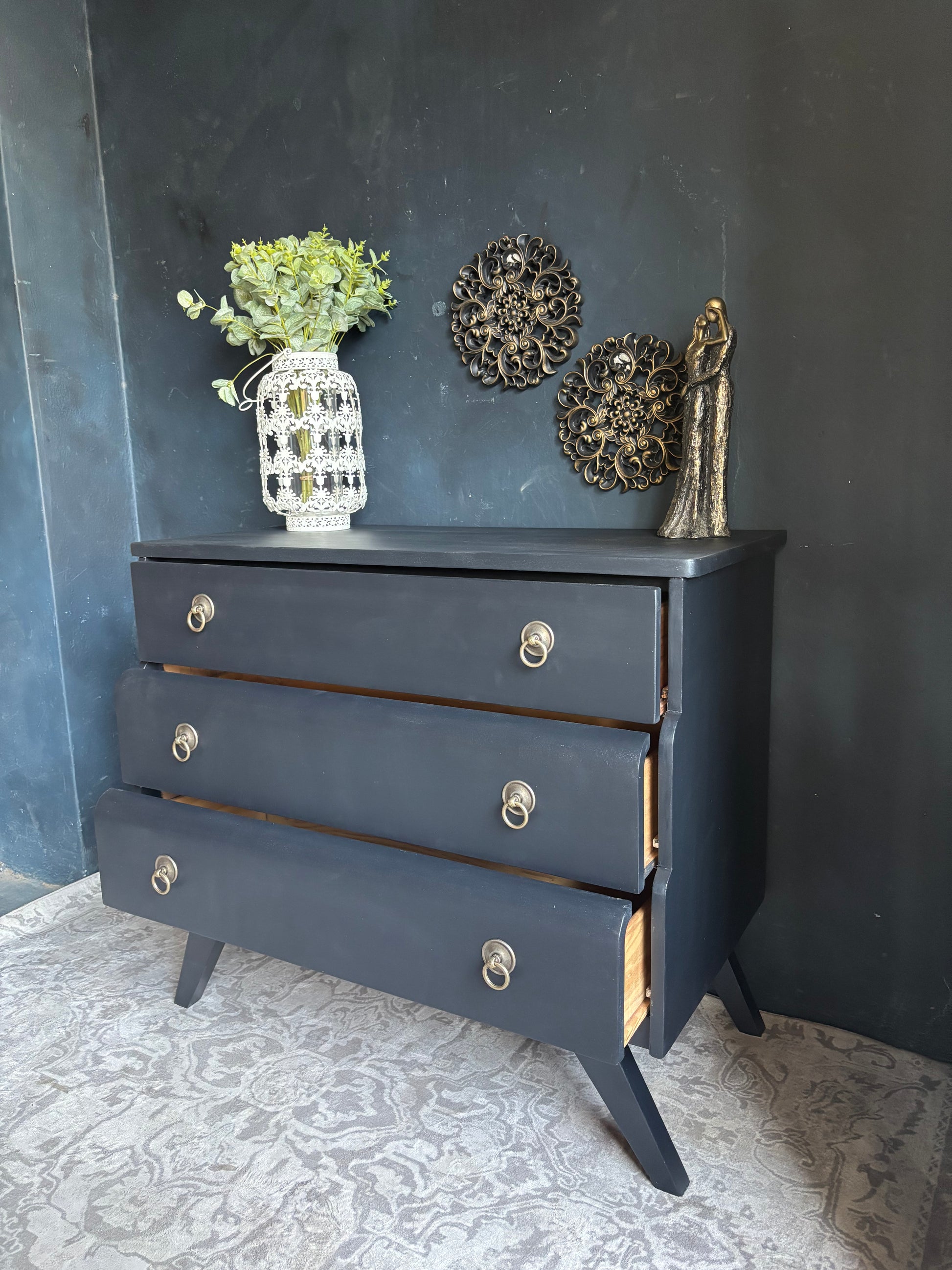 A solid, freshly refinished chest of drawers in a deep navy finish. Clean, contemporary lines with a slightly curved drawer profile and tapered legs make it a versatile piece for bedroom, guest room, or hallway storage.