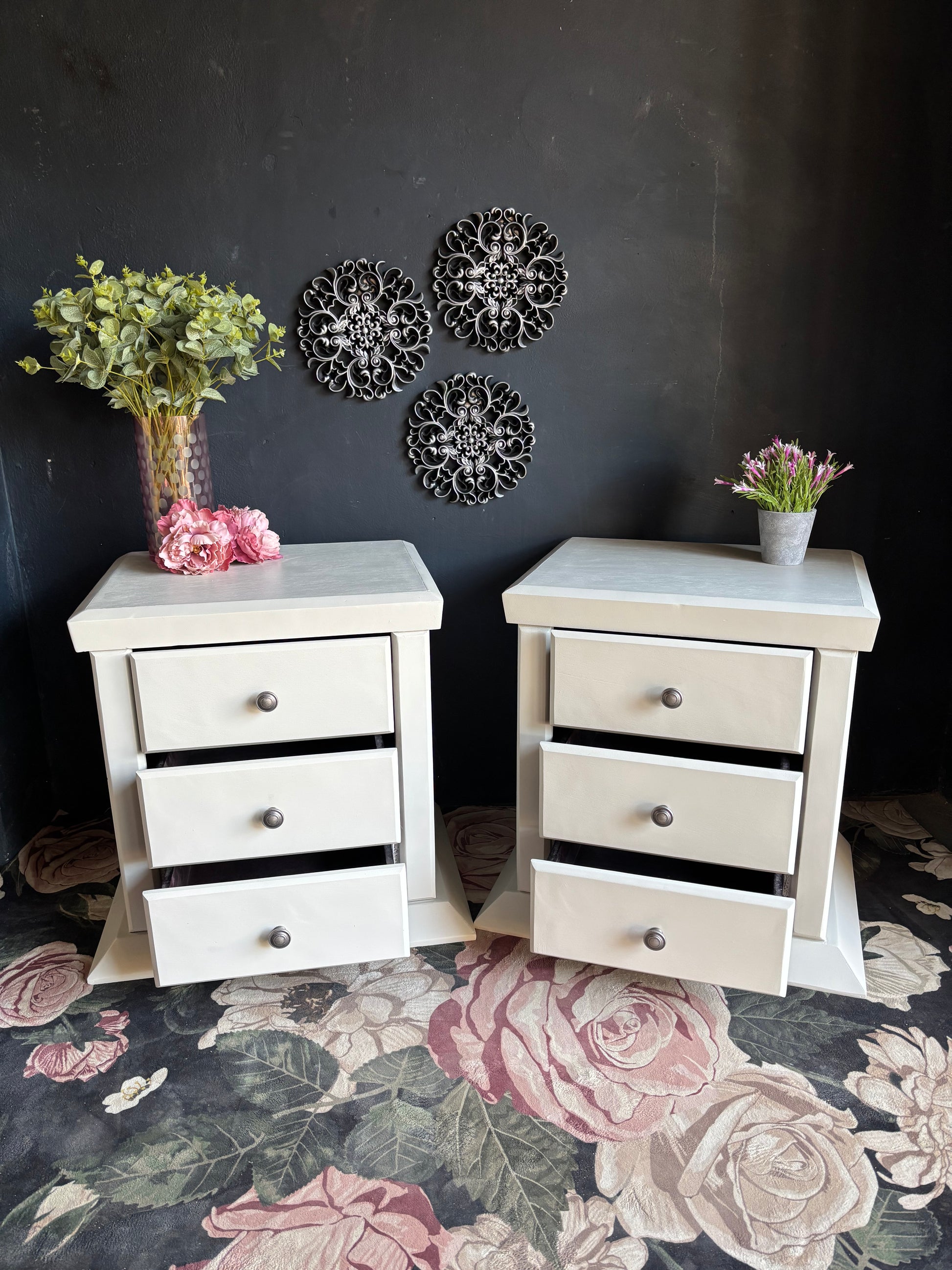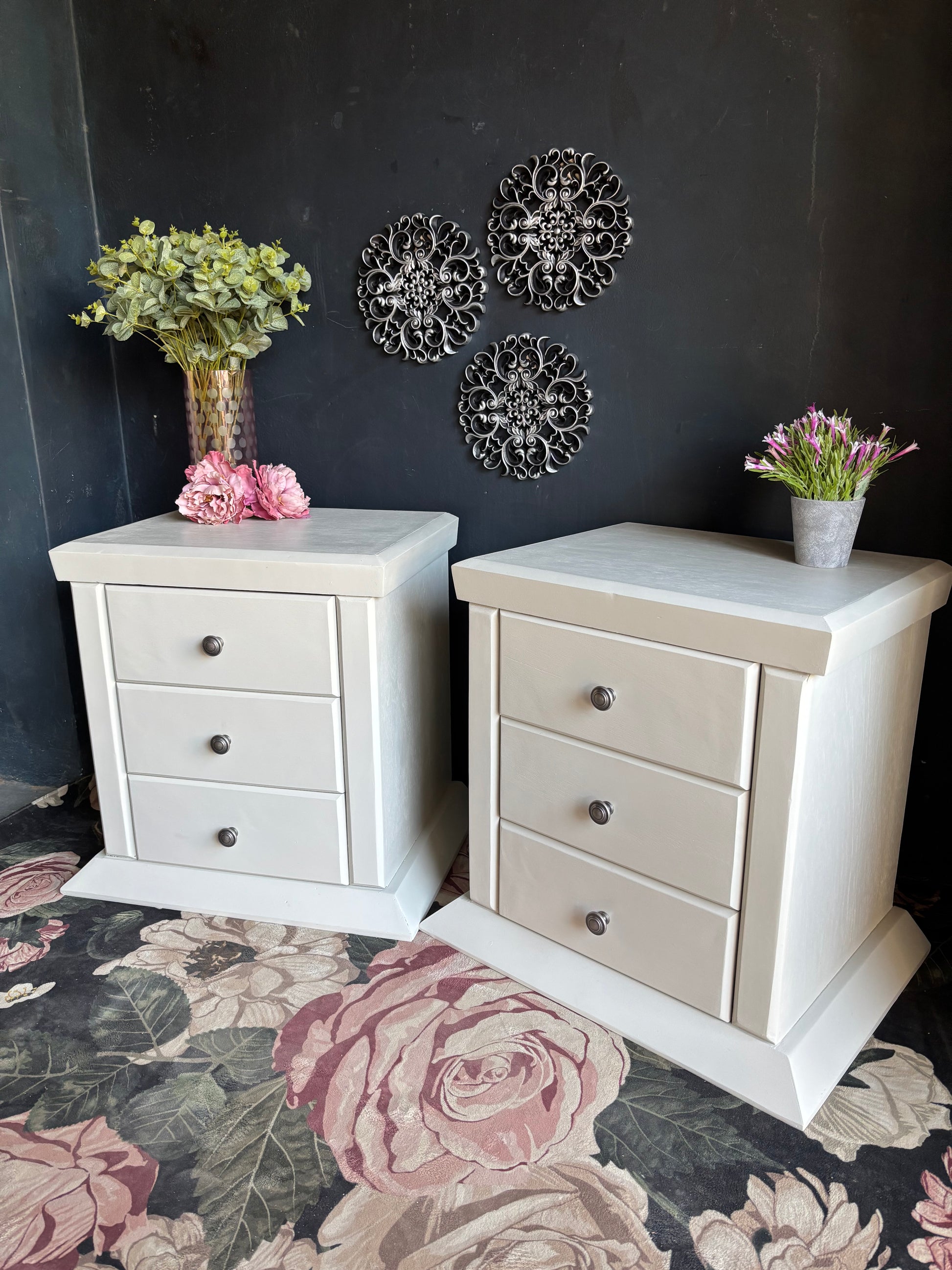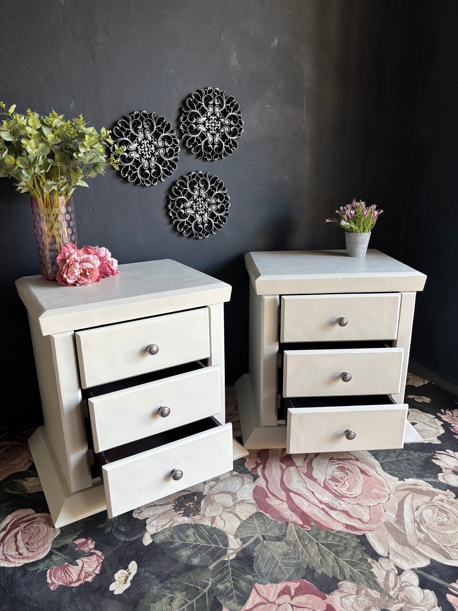 A stylish pair of compact bedside tables finished in a soft white tone. Designed with clean lines and a solid, structured silhouette, these pieces offer practical storage while maintaining a refined and timeless look. Ideal for bedrooms, guest rooms or as side tables in a living space.
