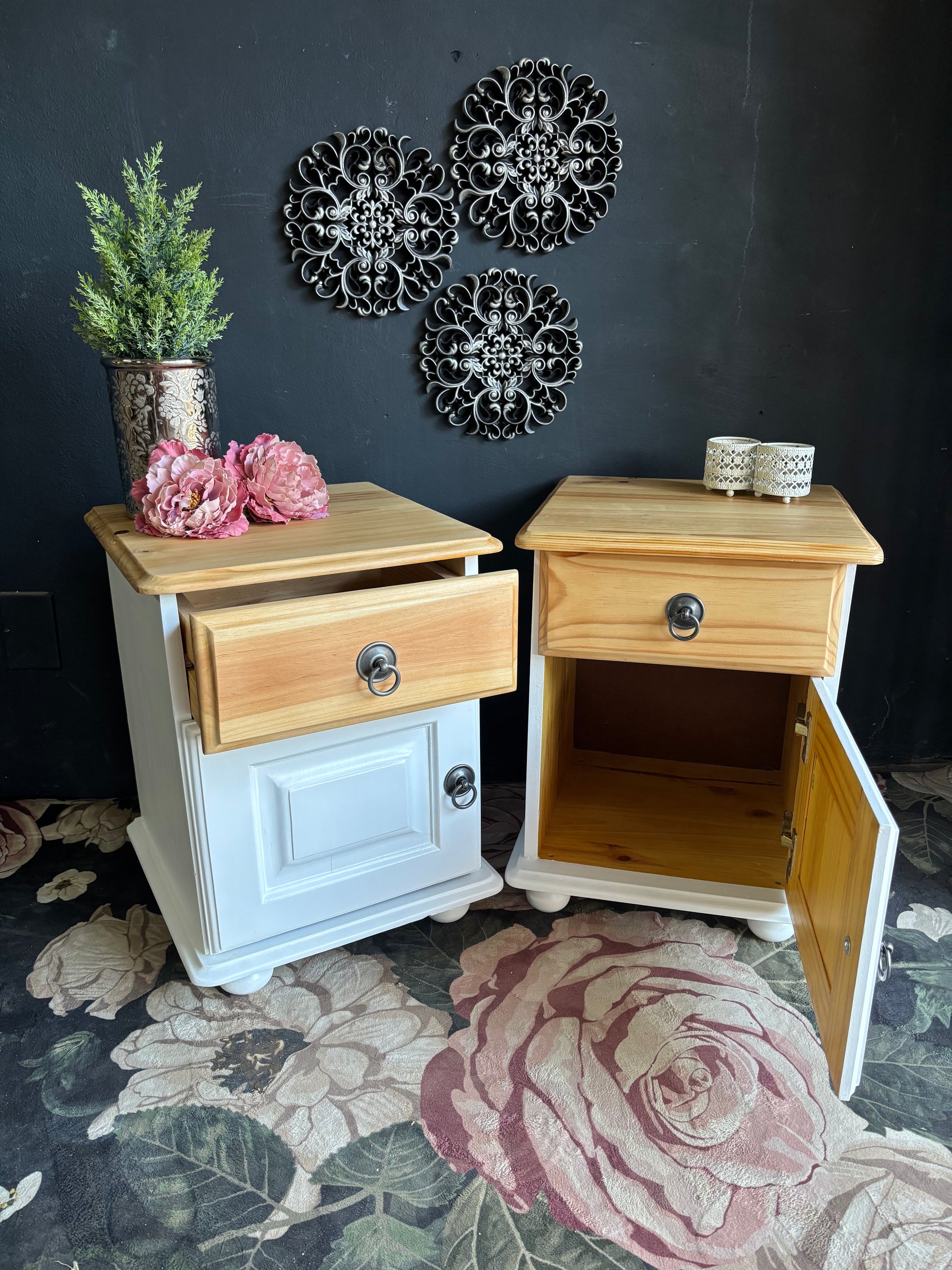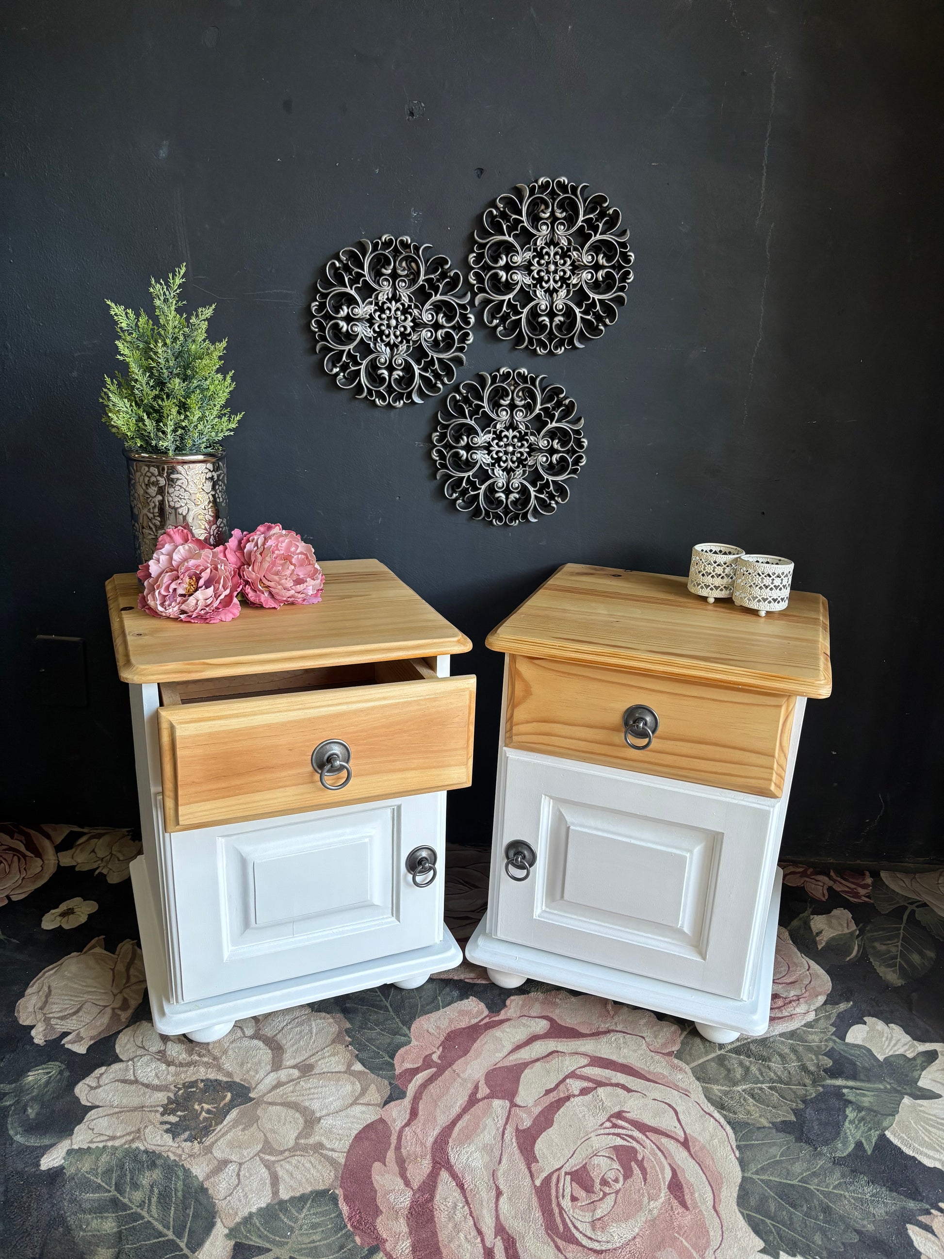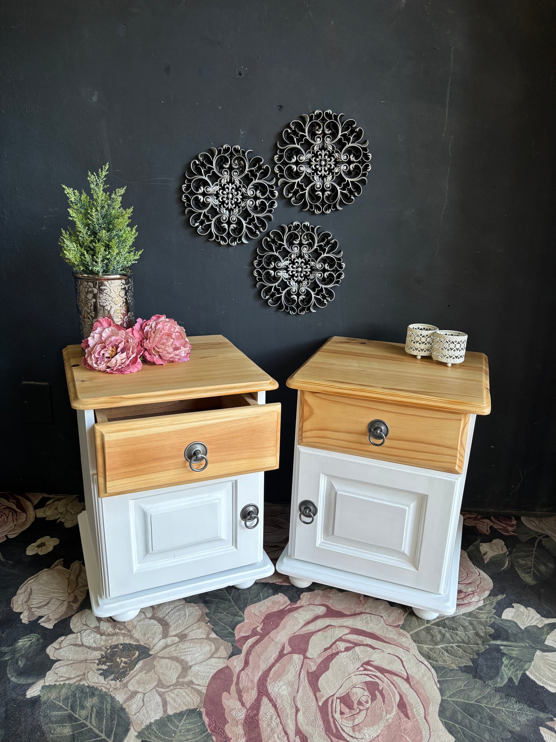 A charming pair of solid wood bedside tables featuring crisp white bases paired with warm pine tops. Each unit includes a smooth-gliding drawer and a spacious lower cabinet, offering both style and practical storage. Their clean, timeless design makes them perfect for both classic and modern interiors.