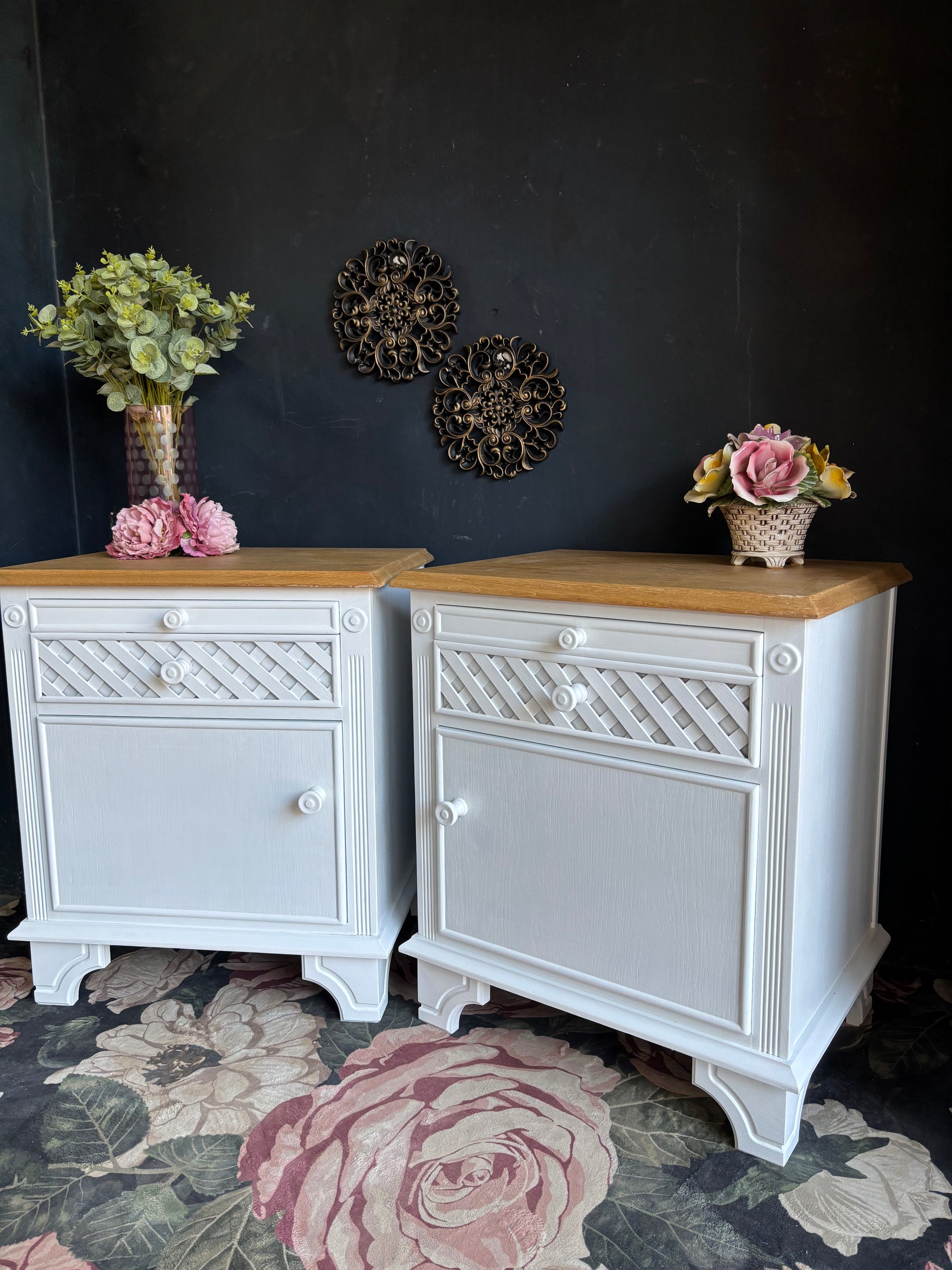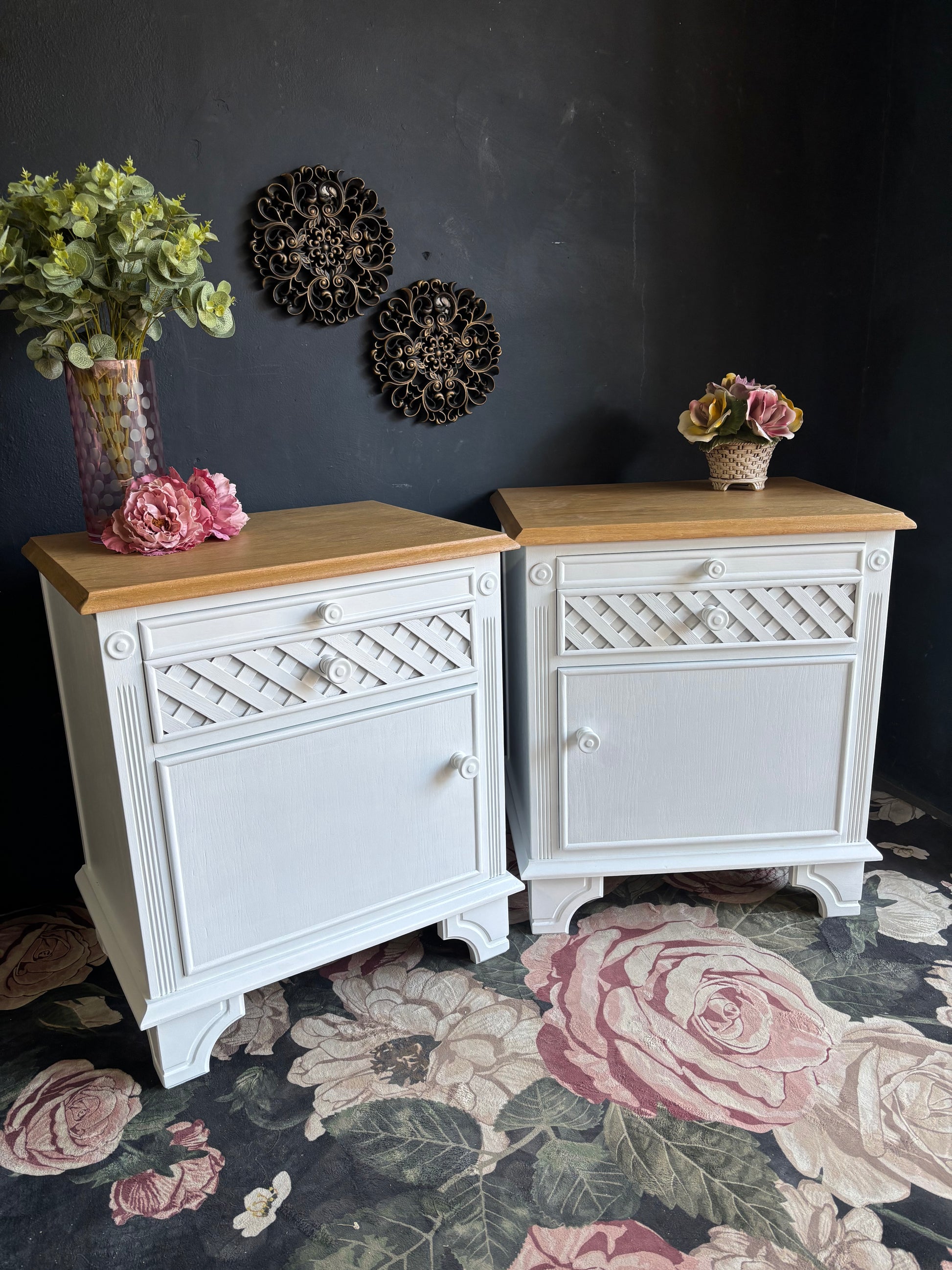 A beautifully restored pair of solid oak bedside pedestals, finished in a fresh white tone with natural oak tops. The charming lattice detail adds character, while the spacious cabinet storage makes them both stylish and practical. Perfect for bedrooms, guest rooms, or as elegant accent cabinets.