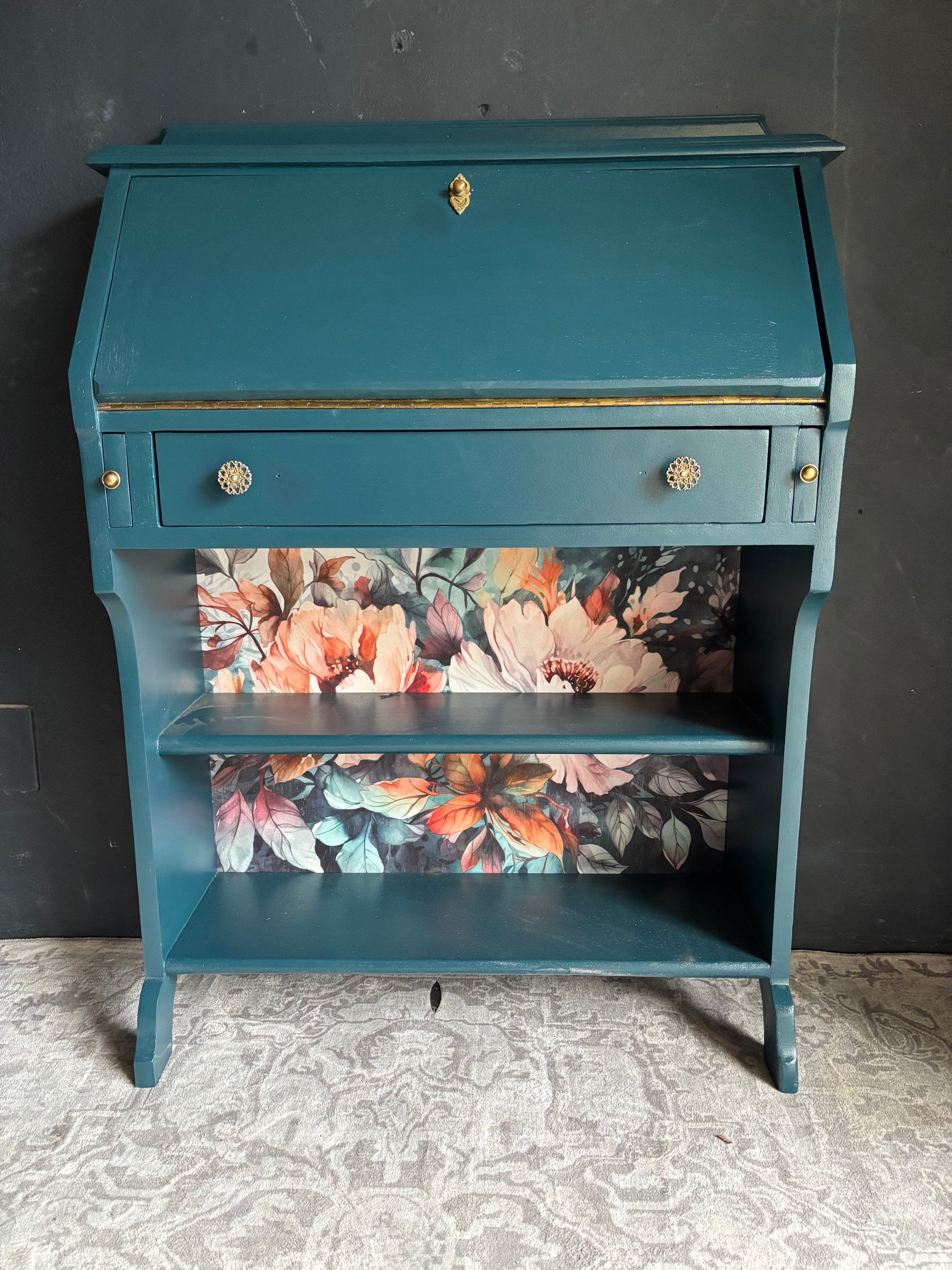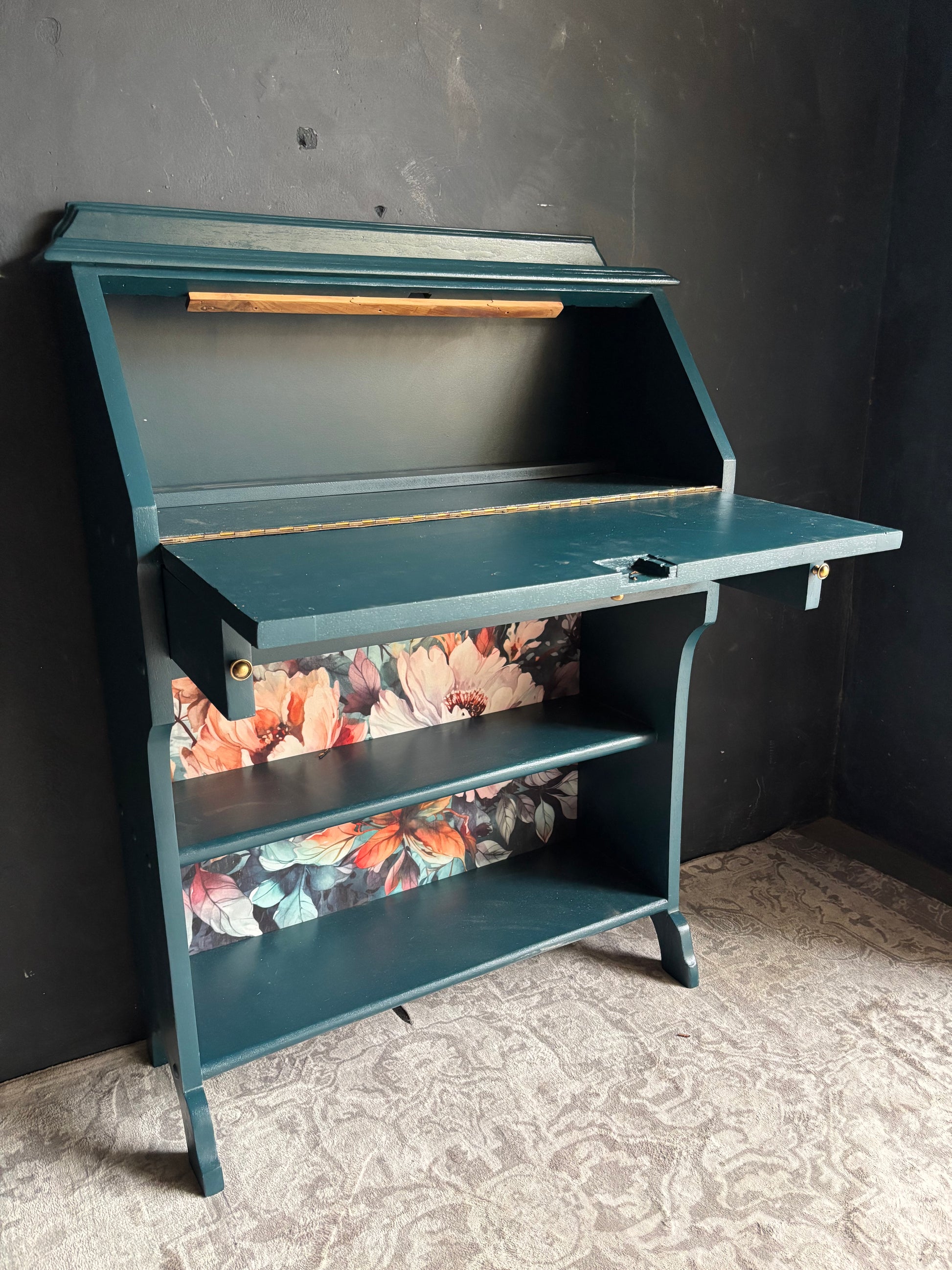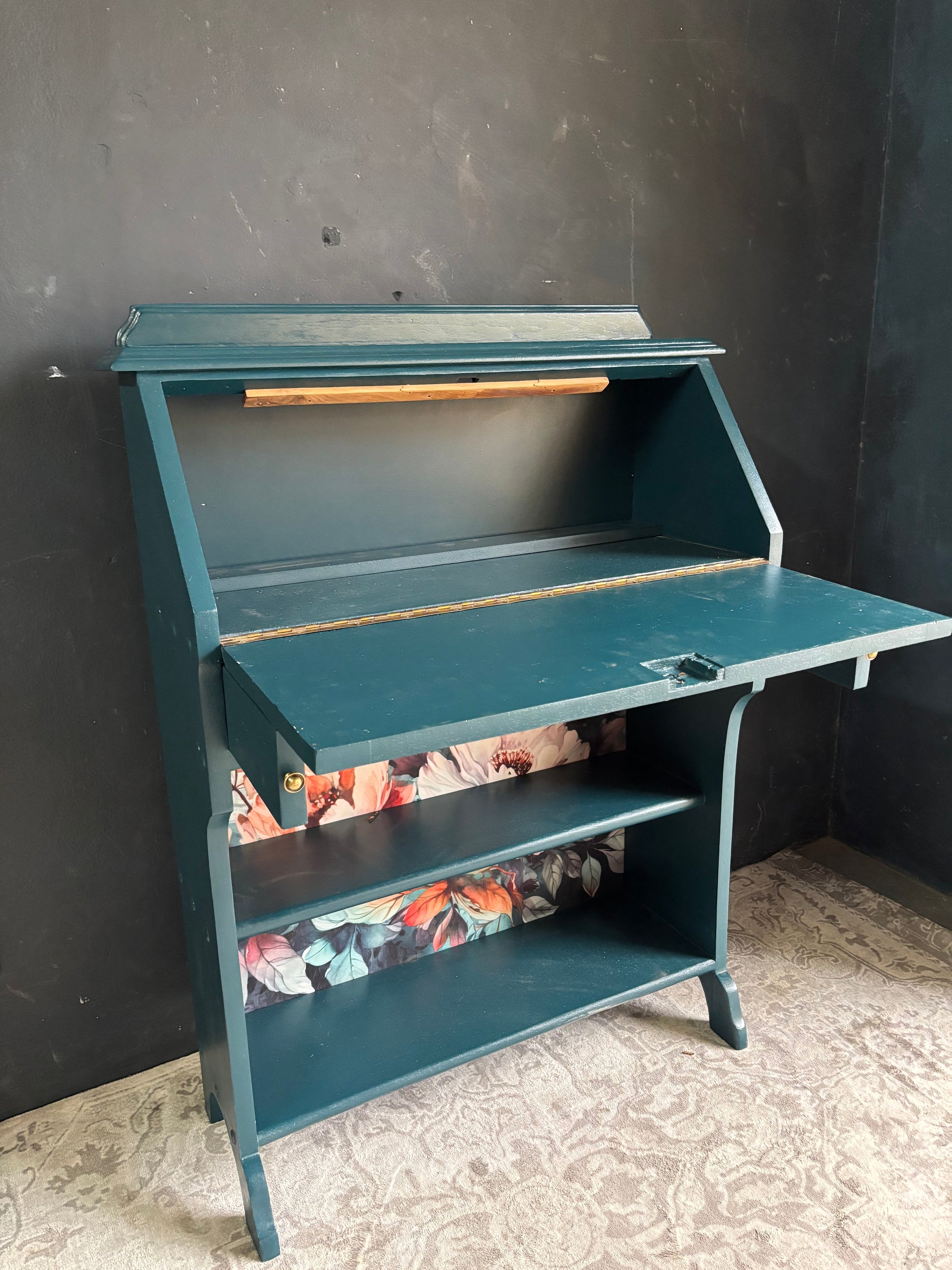 A beautifully restored drop front writing bureau finished in a rich teal tone. This versatile piece features a fold down writing surface that opens to reveal a compact workspace, along with open shelving below for additional storage. The bold floral interior detail adds warmth and personality, making it both practical and visually striking. Ideal for smaller spaces needing a functional yet decorative desk solution.
