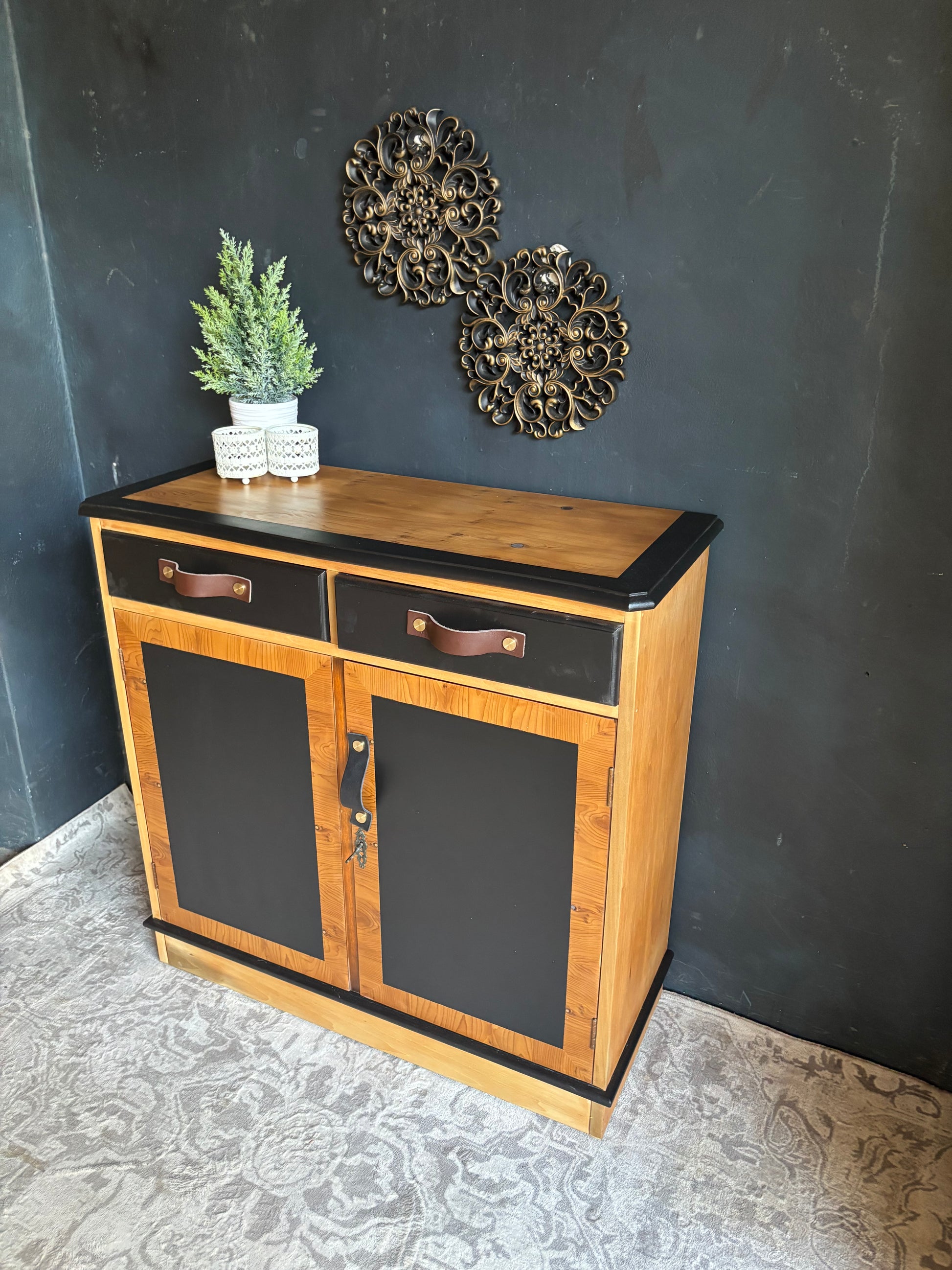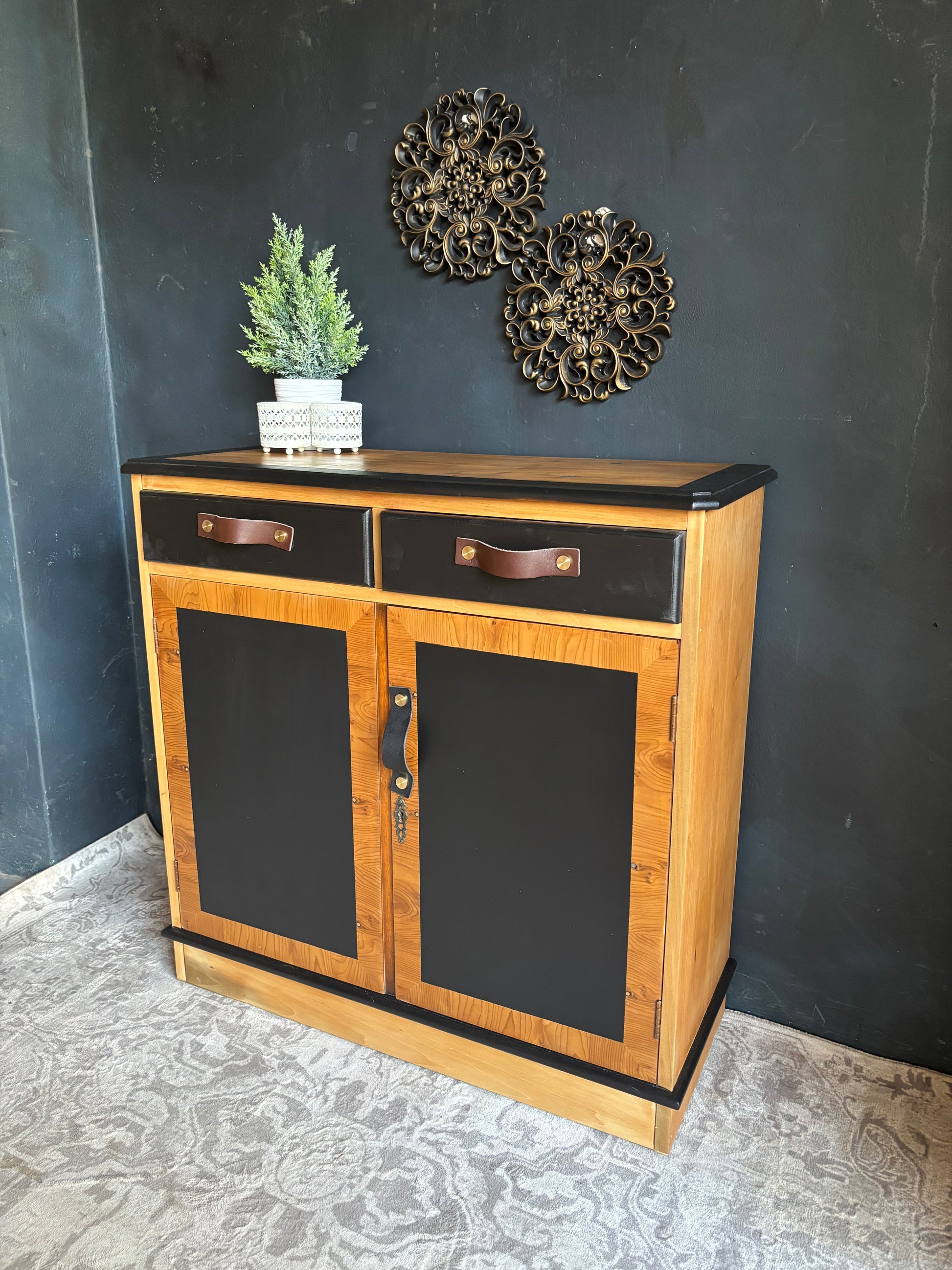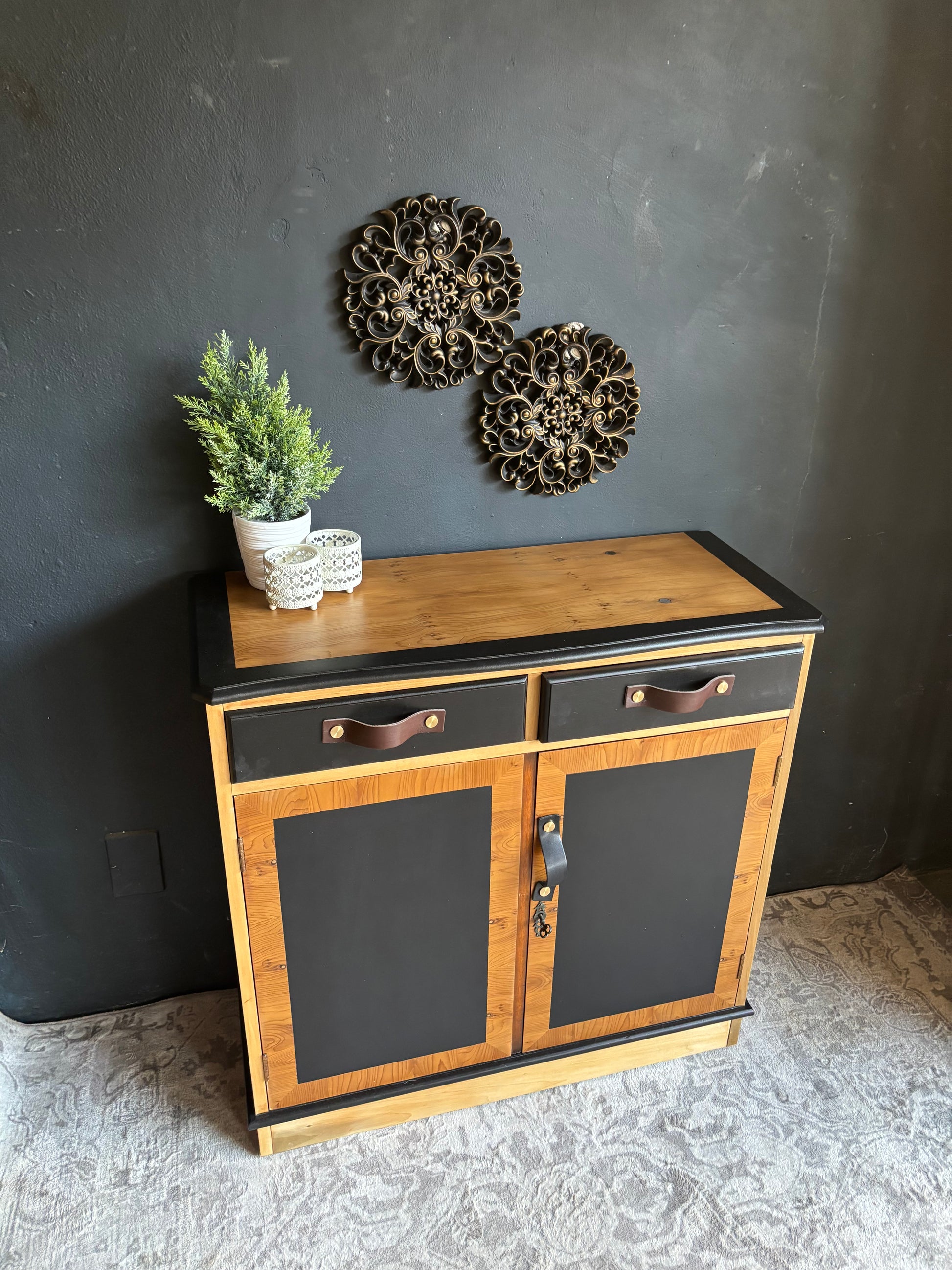 This beautifully restored two-tone cabinet blends rustic wood tones with sleek matte black panels, creating a perfect balance between farmhouse warmth and modern sophistication. Featuring two top drawers with genuine leather handles and a spacious double-door cupboard, it’s ideal for stylish storage in your living room, hallway, or dining space.