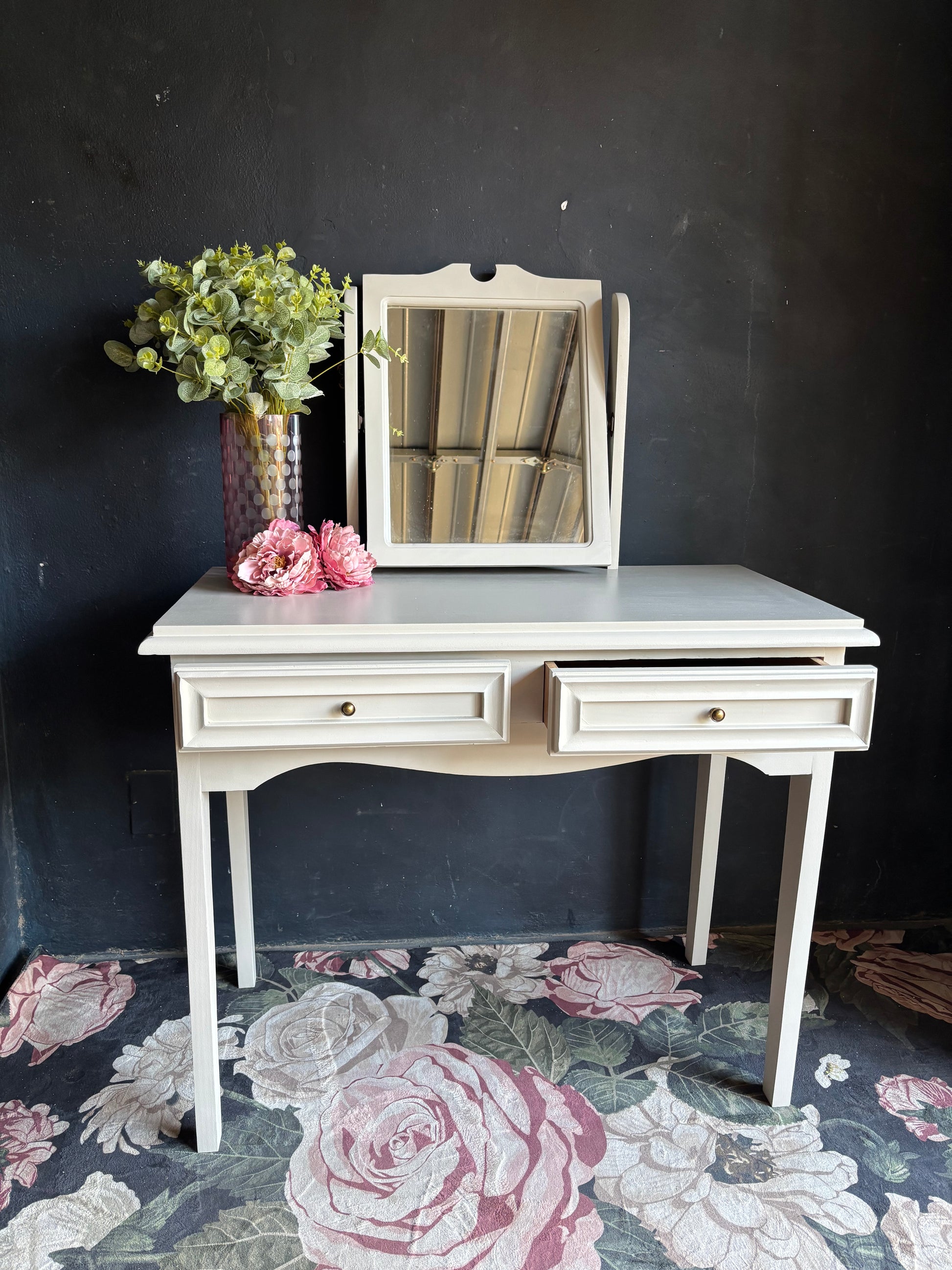 A refined soft white dressing table designed with timeless proportions and understated elegance. Featuring two spacious drawers and a coordinating tilting mirror, this piece blends traditional detailing with clean lines. The gently curved apron and tapered legs create a light, graceful silhouette, making it suitable for both classic and contemporary interiors.